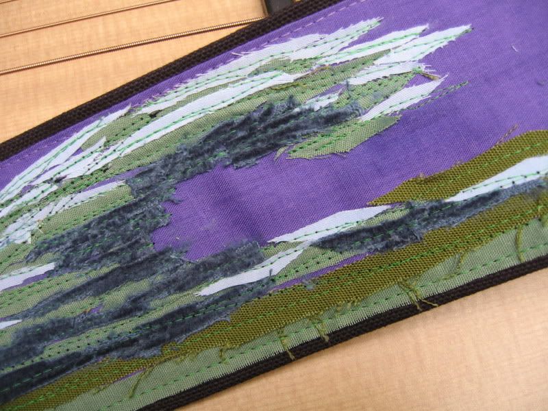 Here are a few pictures of a guitar strap I recently made for my contractor. He commissioned it as a gift for a friend and picked out the colors and theme and I ran with it. I love layering fabric to make a unique design. I often don't know exactly where a project will go, only the general idea of it before I get started. As I design and sew and sew and design and layer more and more colors and fabric, it reveals itself to me.